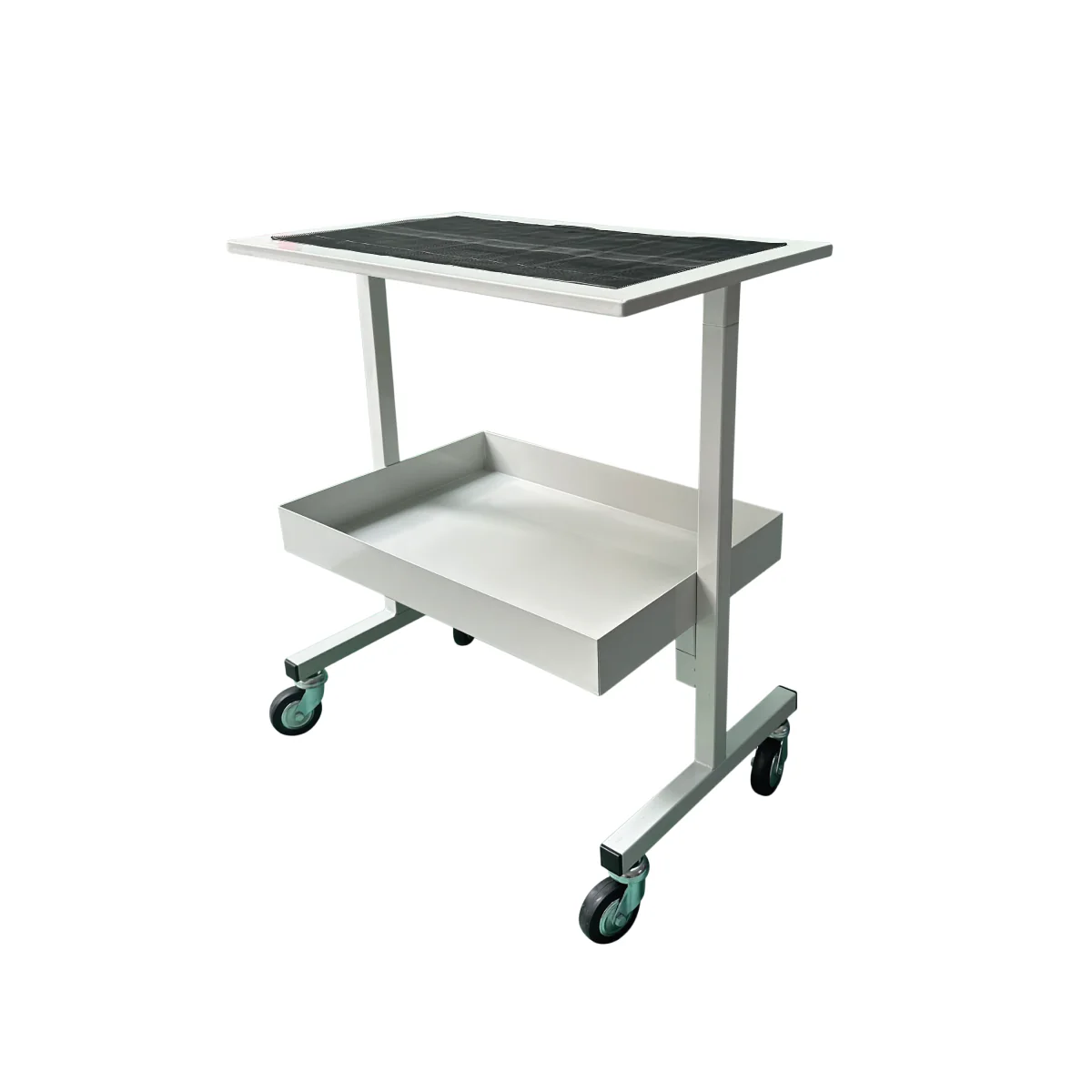 Robusto carrello industriale caratterizzato da un ripiano superiore rivestito in gomma antiscivolo, un vassoio inferiore e solide ruote in gomma.