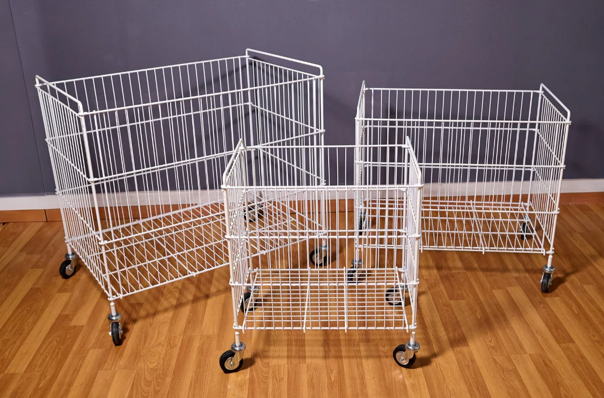 Cesta porta sacchi industriale con sistema di chiusura per ridurre gli ingombri e solide ruote in gomma.